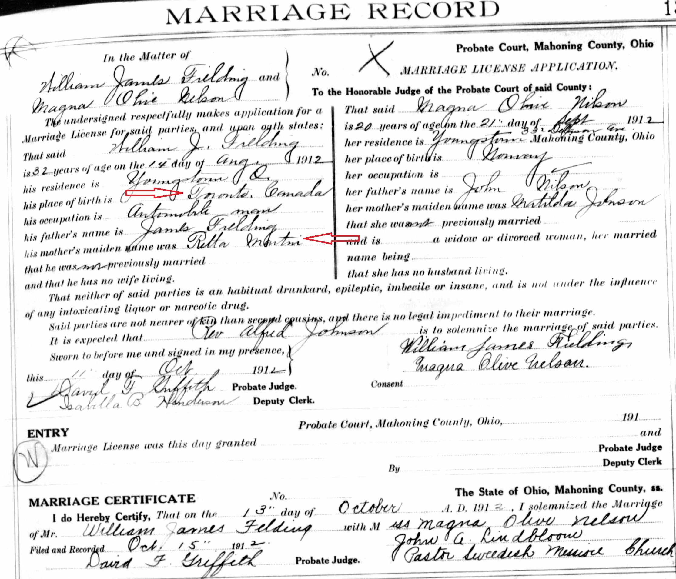 It seems apparent that Will conspired with his sister Jen on how to deal with the question of Rose. Both siblings were living in Youngstown – it would make sense to be sure that their documents matched. On Will and Magna’s marriage certificate, Will also claims his mother is “Retta Martin” and that he was born in Toronto, Canada.