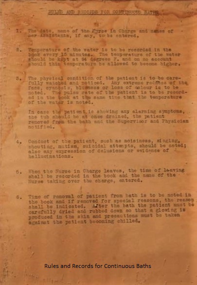 During the 32 years that Rose was a patient at the Hamilton Asylum for the Insane, one of the primary ‘treatments’ she endured was the “continuous bath”. Here’s an example of the rules that Nurses were required to follow.