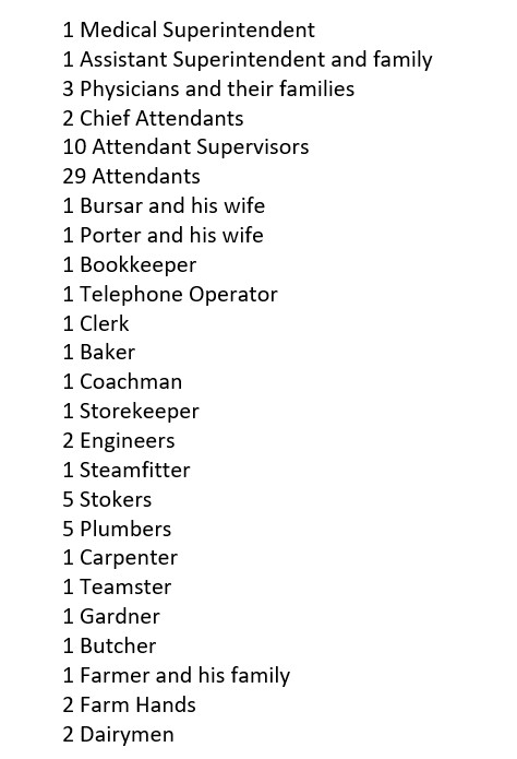 A few years ago, I extracted the following information from the 1911 Census of the Hamilton Asylum for the Insane – by then known as the Ontario Hospital. The staff at Hamilton was typical of the Provincial asylums at the time. I think it helps paint an interesting picture of the types of people who lived on the grounds and worked alongside the patients of the Asylum. This census was taken on June 7-9, 1911.
