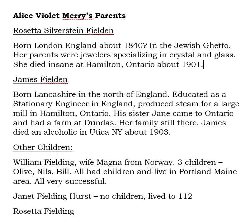 A perfect example of this lies in some papers written by my grandmother, Kathryn Hinman Merry. Nana was a great storyteller and was interested in her genealogy. It was my Nana who shared all these stories with me when I was a child. At one point in her life, Nana documented what she knew about her relatives. She dedicated a page to “Alice Violet Merry’s Parents”.