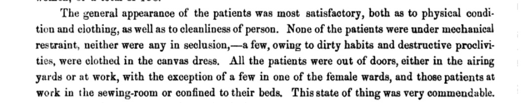 “The general appearance of the patients was most satisfactory, both as the physical condition and clothing, as well as to cleanliness of person. None of the patients were under mechanical restraint, neither were any in seclusion, – a few, owing to dirty habits and destructive proclivities, were clothed in the canvas dress. All the patients were out of doors, either in the airing yard or at work, with the exception of a few in one of the female wards, and those patients at work in the sewing-room or confined to their beds. This state of thing was very commendable.” (1877)