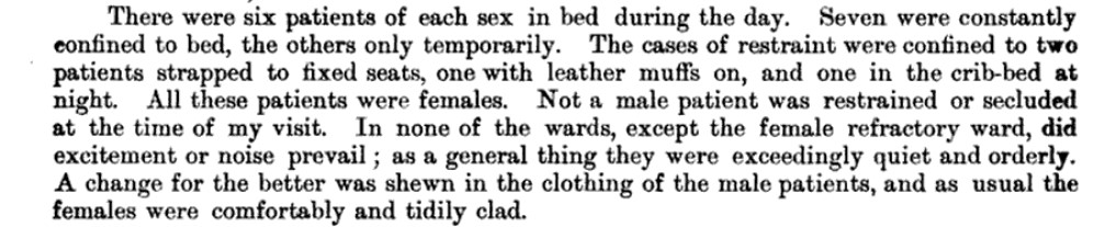 “There were six patients of each sex in bed during the day. Seven were constantly confined to bed, the others only temporarily. The cases of restraint were confined to two patients strapped to fixed seats, one with leather muffs on, and one in the crib-bed at night. All these patients were females. Not a male patient was restrained or secluded at the time of my visit. In none of the wards, except the female refractory ward, did excitement or noise prevail; as a general thing they were exceedingly quiet and orderly. A change for the better was shown in the clothing of the male patients, and as usual the females were comfortably and tidily clad” (1880)