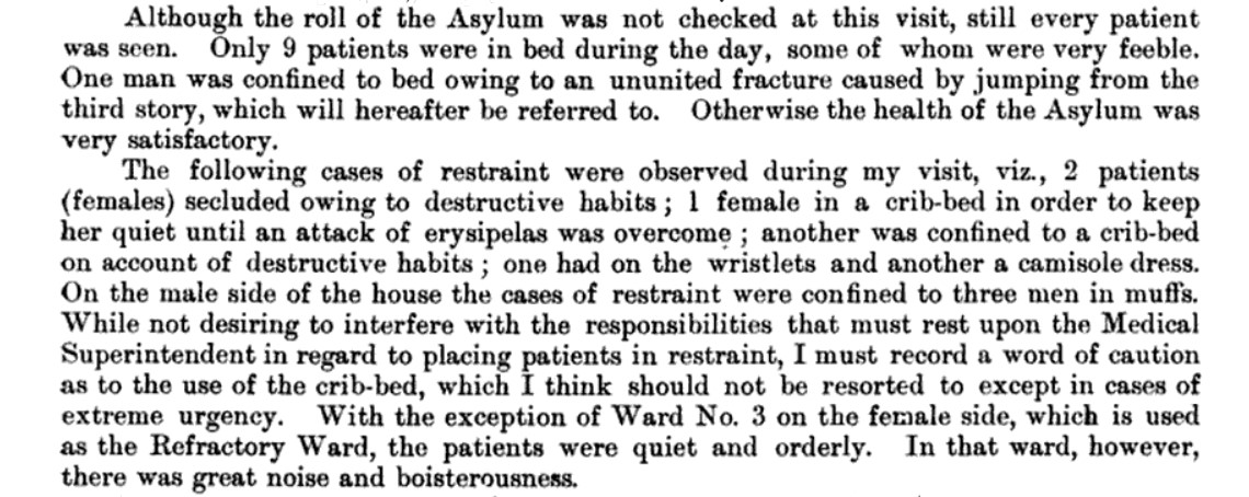 “The following cases of restraint were observed during my visit, viz. 2 patients (females) secluded owing to destructive habits; 1 female in a crib-bed in order to keep her quiet until an attack of erysipelas was overcome; another was confined to a crib-bed on account of destructive habits; one had on the wristlets and another a camisole dress. On the male side of the house the cases of restraint were confined to three men in muffs. While not desiring to interfere with the responsibilities that must rest upon the Medical Superintendent in regard to placing patients in restraint, I must record a word of caution as to the use of the crib-bed, which I think should not be resorted to except in cases of extreme urgency. With the exception of Ward No. 3 on the female side, which is used as the Refractory Ward, the patients were quiet and orderly. In that ward, however, there was great noise and boisterousness.” (Italics added for emphasis) (1881)