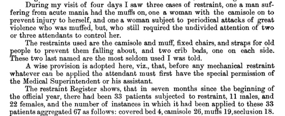“During my visit of four days I saw three cases of restraint, one a man suffering from acute mania had the muffs on, one a woman with the camisole on to prevent injury to herself, and one a woman subject to periodical attacks of great violence who was muffed, but, who still required the undivided attention of two or three attendants to control her.