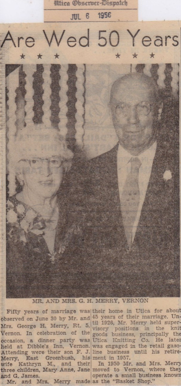 Lived: circa 1950 in Vernon, NY where Alice and George ran The Basket Shop (per Utica Observer Dispatch news article on the couple’s 50th wedding anniversary.)