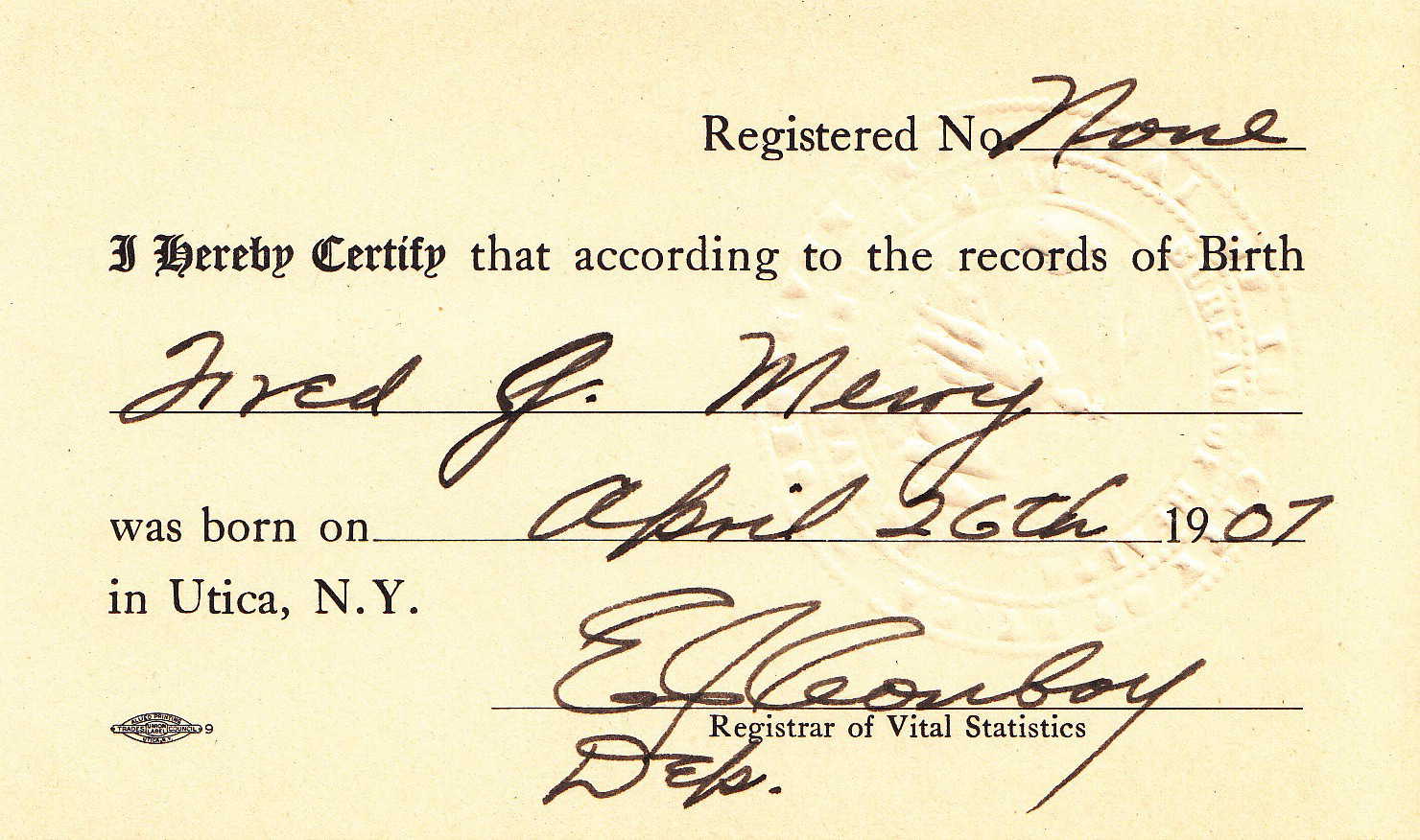 Marriage: To George Harold Merry – June 30, 1906 (per Utica City Clerk record). Notice that Alice names her mother as “Roselle Feltstaff”, not Rosetta Silverstein. (For more information about this, see the “Family Secrets” post.)
