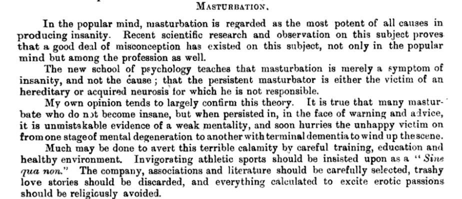 He states, “My own opinion tends to largely confirm this theory. It is true that many masturbate who do not become insane, but when persisted in, in the face of warning and advice, it is unmistakable evidence of a weak mentality, and soon hurries the unhappy victim on from one stage of mental degeneration to another with terminal dementia to wind up the scene.”