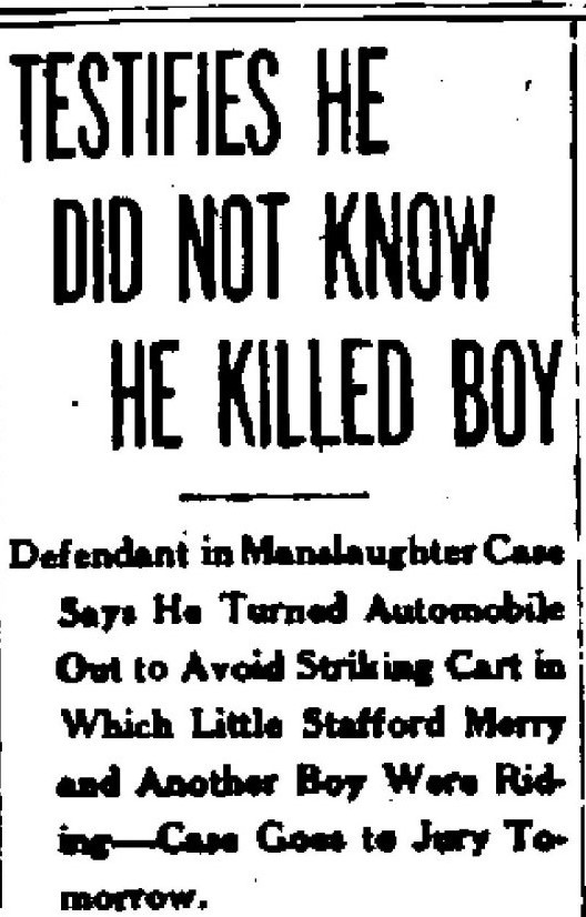 “Stafford F. Merry, Eleven Years Old, of 711 Court St., Crushed By Car and Died in Hospital – Three Little Falls Men Arrested and Brought Back to City.”