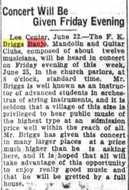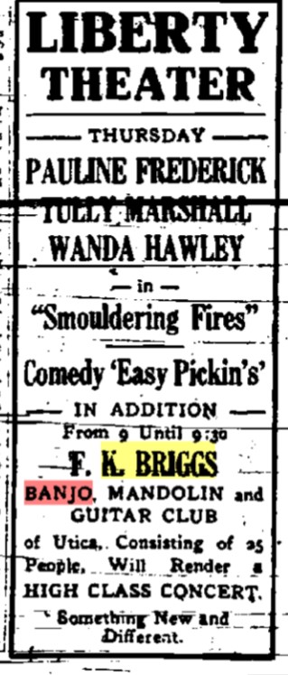 As it turns out, Pop had been quite an accomplished banjo player when he was a young man. I’m not certain when his musical instruction began, but by 1925, 18-year-old Frederick James Merry was an advanced student with the F. K. Briggs’ Banjo, Mandolin and Guitar Clubs in Utica, NY. Briggs was a renowned music teacher and instrument dealer. His Clubs were featured in venues all over New York State.