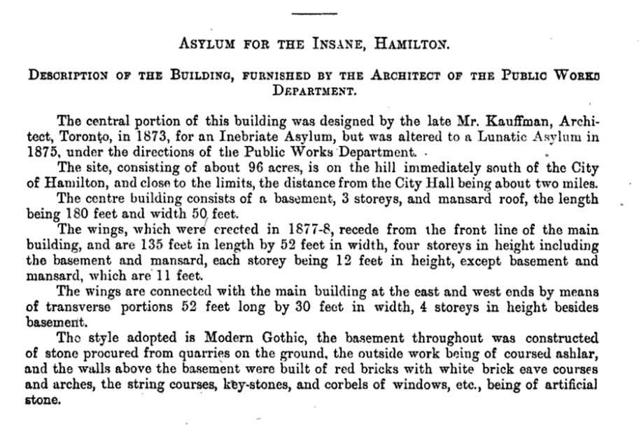 “The central portion of this building was designed by the late Mr. Kauffman, Architect, Toronto, in 1873, for an Inebriate Asylum, but was altered to a Lunatic Asylum in 1875, under the directions of the Public Works Department.
