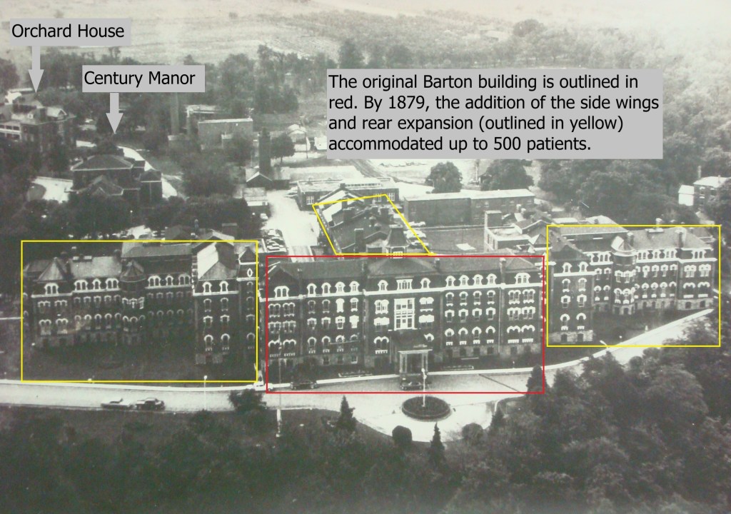 The Hamilton Asylum for the Insane first opened its doors in 1876. By 1879, the original building (called the Barton building) had been expanded by adding three wings to the original building – one at each end and a third extending from the back of the building. It could now accommodate about 500 patients.