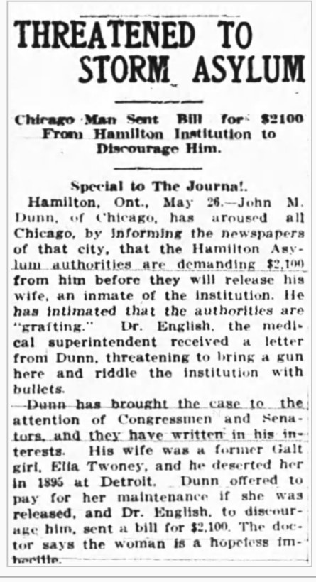 “Hamilton, Ont., May 26 – John M. Dunn, of Chicago, has aroused all Chicago, by informing the newspapers of that city, that the Hamilton Asylum authorities are demanding $2100 from him before they will release his wife, and inmate of the institution. He has intimated that the authorities are ‘grafting’. Dr. English, the medical superintendent received a letter from Dunn, threatening to bring a gun here and riddle the institution with bullets.”