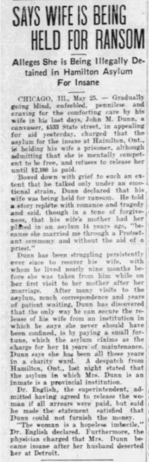 “CHICAGO, Ill., May 25. – Gradually going blind, enfeebled, penniless and craving for the comforting care by his wife in his last days, John M Dunn, a canvasser, 4533 State street, is appealing for aid yesterday, charged that the asylum for in insane at Hamilton,Ont., is holding his wife a prisoner, although admitting that she is mentally competent to be free, and refuses to release her until $2100 is paid.”