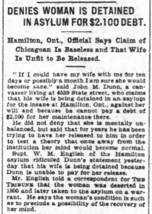 “’If I could have my wife with me for ten days or possibly a month I am sure she would become sane,’ said John M. Dunn, a canvasser living at 4533 State street, who claims that his wife is being detained in an asylum for the insane at Hamilton, Ont., against her will and because he cannot pay a debt of $2,100 for her maintenance there.”
