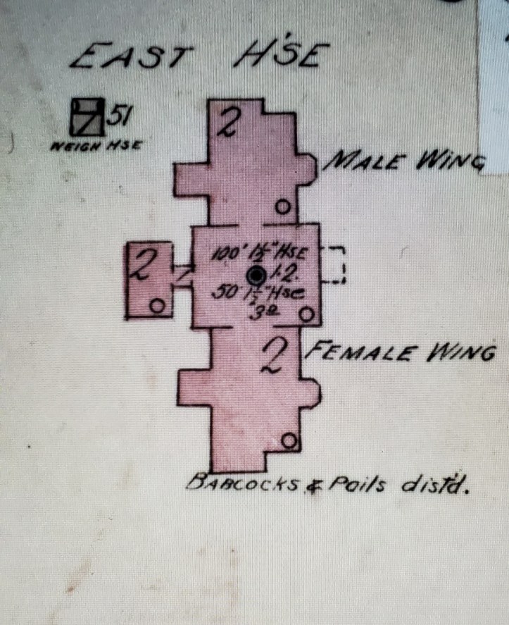 “West House” was never built on the Asylum property. In 1888, a larger building called Orchard House opened on the grounds. But Orchard House was farther east than East House. Surely, it couldn’t be what was meant to be “West House”. Also, as evidenced by the 1911 fire insurance map, East House continued to have both a male and female wing.