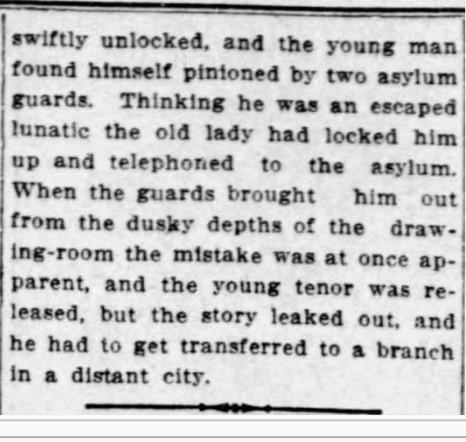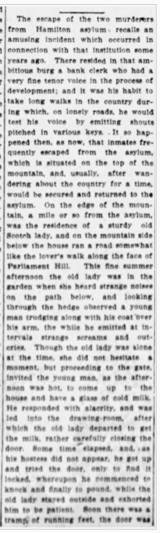 “The escape of the two murderers from Hamilton asylum recalls an amusing incident which occurred in connection with that institution some years ago. There resided in that ambitious burg a bank clerk who had a very fine tenor voice in the process of development; and it was his habit to take long walks in the country during which, on lonely roads, he would test his voice by emitting shouts pitched in various keys. It so happened then, as now, that inmates frequently escaped from the asylum, which is situated on the top of the mountain, and, usually, after wandering about the country for a time, would be secured and returned to the asylum. On the edge of the mountain, a mile or so from the asylum, was the residence of a sturdy old Scotch lady, and on the mountain side below the house ran a road somewhat like the lover’s walk along the face of Parliament Hill. This fine summer afternoon the old lady was in the garden when she heard strange noises on the path below, and looking through the hedge observed a young man trudging along with his coat over his arm, the while he emitted at intervals strange screams and outcries. Though the old lady was alone at the time, she did not hesitate a moment, but proceeding to the gate invited the young man, as the afternoon was hot, to come up to the house and have a glass of cold milk. He responded with alacrity, and was led into the drawing room, after which the old lady departed to get the milk, rather carefully closing the door. Some time elapsed, and, as his hostess did not appear, he got up and tried the door, only to find it locked, whereupon he commenced to knock and finally to pound, while the old lady stayed outside and exhorted him to be patient. Soon there was a tramp of running feet, the door was swiftly unlocked, and the young man found himself pinioned by two asylum guards. Thinking he was an escaped lunatic the old lady had locked him up and telephoned to the asylum. When the guards brought him out from the dusky depths of the drawing-room the mistake was at once apparent, and the young tenor was released, but the story leaked out, and he had to get transferred to a branch in a distant city.”