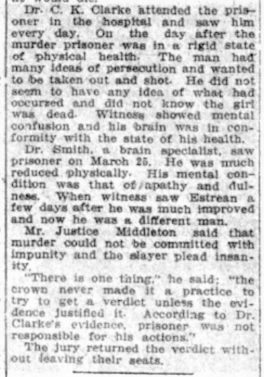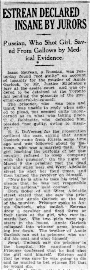“Isaac Estrean, a Russian, was yesterday found ‘not guilty’ on account of insanity for the murder of Annie Garlock, by Mr. Justice Middleton’s jury at the assize court and was ordered to be detained at the Toronto jail pending the pleasure of the governor-general-in-council.”