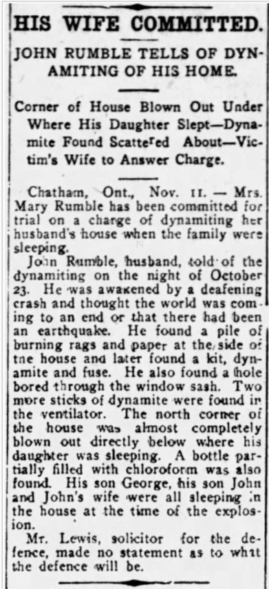 “Chatham, Ont., Nov. 11. – Mrs. Mary Rumble has been committed for trial on a charge of dynamiting her husband’s house when the family were sleeping.”