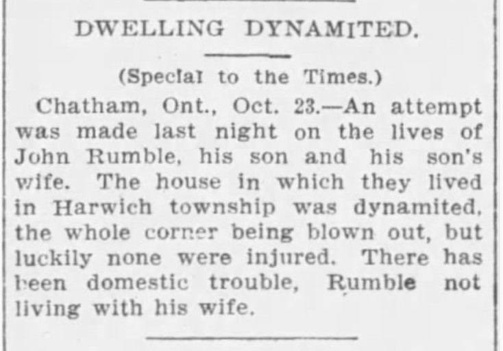 “Chatham, Ont., Oct. 23. – An attempt was made last night on the lives of John Rumble, his son and his son’s wife. The house in which they lived in Harwich township was dynamited, the whole corner being blown out, but luckily none were injured. There has been domestic trouble, Rumble not living with his wife.”