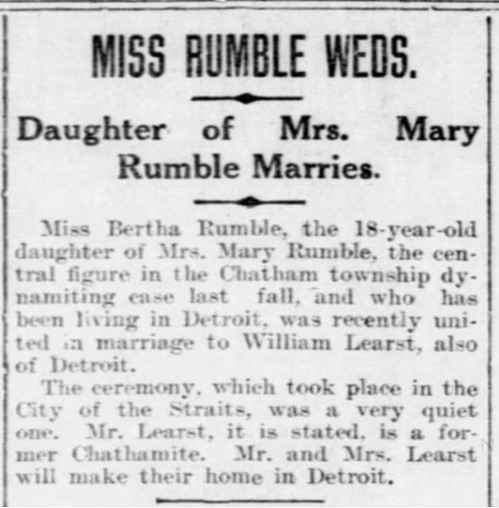 “Miss Bertha Rumble, the 18-year-old daughter of Mrs. Mary Rumble, the central figure in the Chathan township dynamiting case last fall, and who has been living in Detroit, was recently united in marriage to William Learst, also of Detroit.”